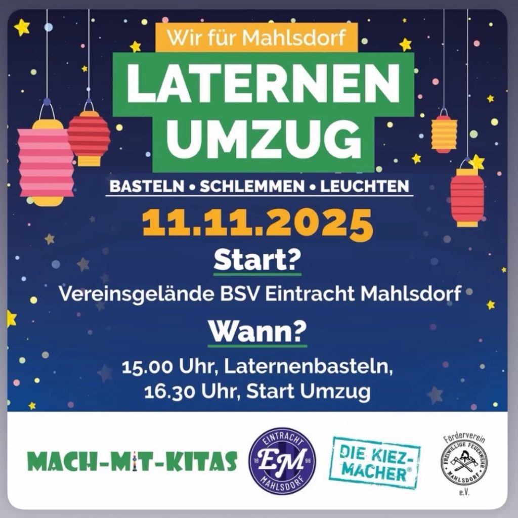 Los geht’s ab 15 Uhr am und im Vereinsheim von Eintracht Mahlsdorf. Die Organisatoren, neben den „Mach-mit-Kitas“ auch Eintracht Mahlsdorf, der Förderverein der Freiwilligen Feuerwehr Mahlsdorf sowie das „Kiezmacher“-Projekt der CDU Wuhletal, beginnen dann mit einem kreativen Laternen-Basteln für Jedermann. Dazu gibt’s Musik, einen Popcorn-Stand, Kinderpunsch und Glühwein, Waffeln, Kuchen, Zuckerwatte und Kaffee.