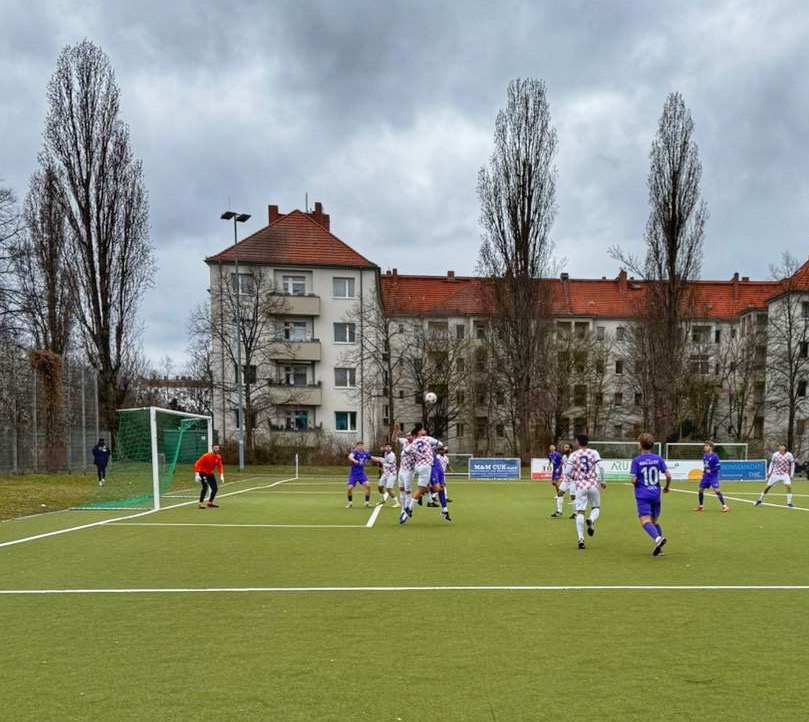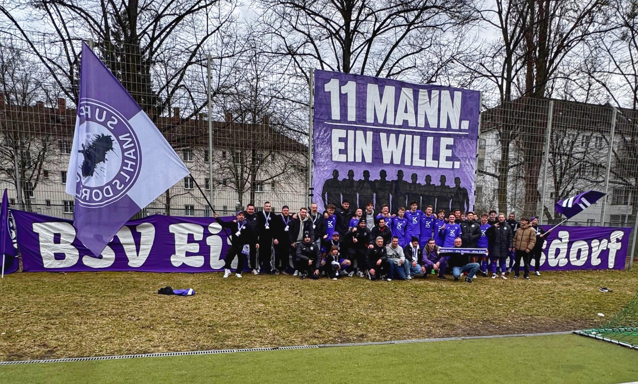 Nach dem Schlusspfiff wurde gefeiert. Spieler und Fans von Eintracht Mahlsdorf versammelten sich gemeinsam für ein großes Foto vor einem lilanen Banner, dahinter ein großes Plakat mit der Aufschrift: „Elf Mann. Ein Wille“. Auch die dafür verantwortliche Fan-Gruppierung „Supporters Mahlsdorf“ war beim Auswärtsspiel bei Croatia Berlin wieder dabei und unterstützte ihr Team lautstark. Vielleicht auch ein Faktor dafür, dass Mahlsdorf im Jahr 2026 weiterhin ungeschlagen bleibt: Drei Siege und ein Unentschieden stehen inzwischen zu Buche.