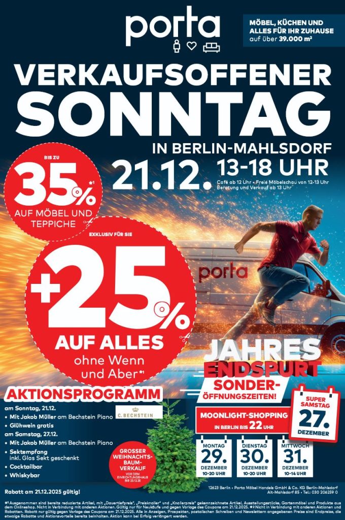 Wenn sich das Jahr dem Ende neigt, wird Berlin leiser. Lichter funkeln, der Duft von Tannengrün liegt in der Luft – und in Mahlsdorf entsteht ein Ort, an dem Einkaufen mehr ist als Erledigung. Unser „Alles Mahlsdorf“-Partner, das porta-Einrichtungshaus an der B1, lädt zum vorweihnachtlichen Jahresendspurt.