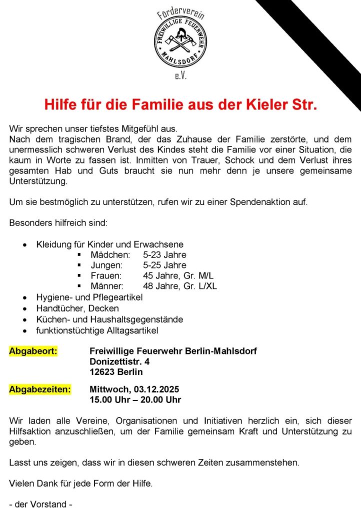 Was sich am Montagabend in der Kieler Straße in Mahlsdorf abspielte, ist nicht in Worte zu fassen. Ein Feuer hat das Zuhause einer Großfamilie genommen, der unermesslich schwere Verlust eines siebenjährigen Sohnes ist nicht in Worte zu fassen. Inmitten von Trauer, Schock und Bestürzung braucht die Familie Unterstützung. Und die soll sie bekommen: Denn Mahlsdorf hält zusammen. Morgen findet in unserem Ortsteil eine große Sachspenden-Aktion statt.