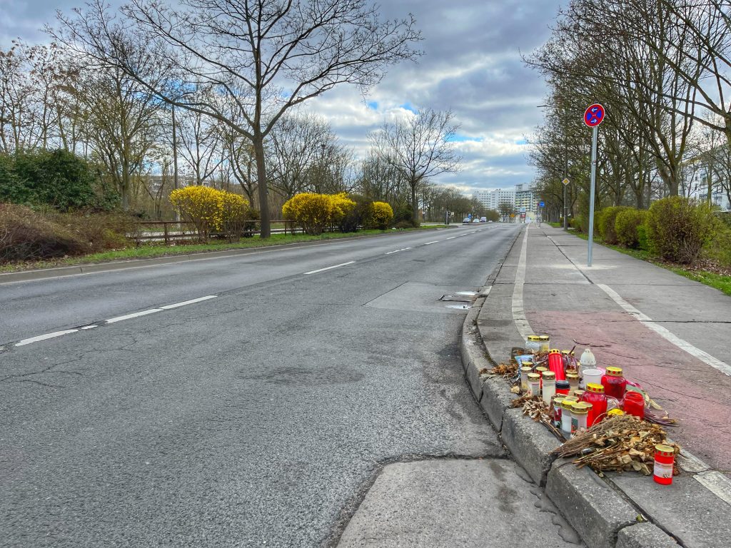 Noch immer erinnern Dutzende Grabkerzen, Gedenkzettel und verwelkte Blumen in der Hellersdorfer Straße an den tragischen Tod der Mahlsdorferin Janine. Mitte Februar war sie hier, kurz vor der Einmündung zur Luzinstraße in Kaulsdorf-Nord, mit ihrem Auto in das Heck eines parkenden Lkw gekracht. Nun gibt es in der Straße ein neues, striktes Park- und Halteverbot.