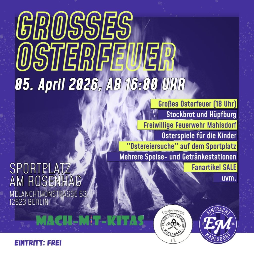 Wenn sich Anfang April die Dämmerung senkt und die ersten Flammen in den Abendhimmel schlagen, wird es auf dem Rosenhag wieder besonders stimmungsvoll. Das traditionelle Osterfeuer von Eintracht Mahlsdorf lädt am 5. April zu einem großen Familienfest ein, mit einem vielfältigen Programm für Jung und Alt.