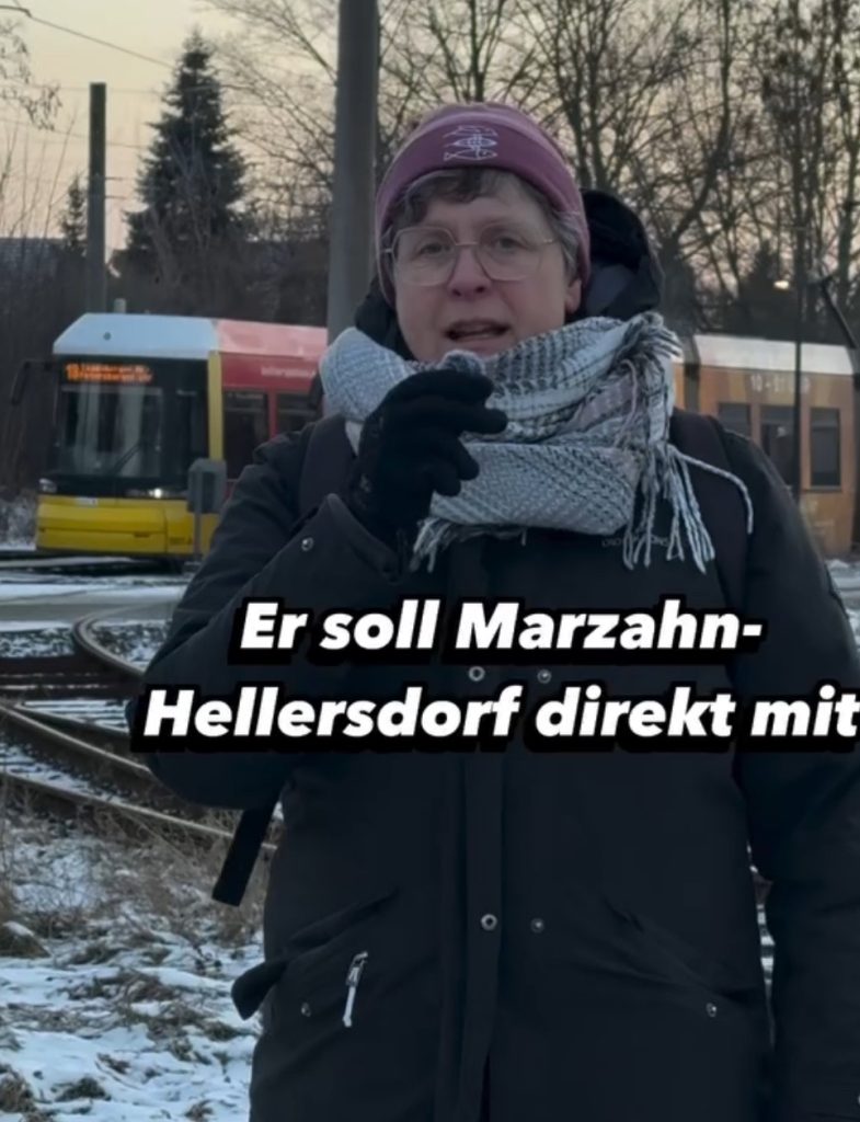 In dem Video äußern sich Manuela Neubert, Direktkandidatin für Mahlsdorf bei der Abgeordnetenhauswahl im kommenden September, sowie Niclas Rother, Direktkandidat in Marzahn-Nord. Der „Tramring Ost“ soll Köpenick über Mahlsdorf mit Hellersdorf verbinden und damit eine Lücke im bestehenden Netz schließen. Derzeit wird die Verbindung zwischen Mahlsdorf und Hellersdorf vor allem durch die Buslinie 195 abgedeckt. Neubert sieht in dem Projekt einen Gewinn für den öffentlichen Nahverkehr im Bezirk. „Der Tramring Ost würde Buslinien entlasten, Wege verkürzen und den ÖPNV attraktiver machen“, sagt sie in dem Video. Aus Sicht der Grünen wäre die neue Straßenbahntrasse ein zentraler Baustein für eine bessere und verlässlichere Mobilität in Marzahn-Hellersdorf. „Das ist unsere Vision für gute und verlässliche Mobilität in Marzahn-Hellersdorf“, so Neubert. Die geplante Trasse würde dort ansetzen, wo die Straßenbahn heute endet: am Bahnhof Mahlsdorf. Bislang müssen Passagiere aus der Treskowstraße bis zur Bushaltestelle gegenüber der „Snackdiele“ am Rewe-Supermarkt laufen, mit der Idee würde die Tram 62 unter der der Brücke in der Hönower Straße hindurchfahren. Von dort aus ginge es über den Kreisverkehr am Jacques-Offenbach-Platz, über die Ridbacher Straße, das Grundstück der Grundschule am Schleipfuhl bis zur Nossener Straße in Hellersdorf. Entlang der Nossener Straße existiert eine Fläche, die bereits vor Jahrzehnten für eine Straßenbahntrasse freigehalten wurde. Derzeit befinden sich dort Parkplätze und Grünflächen. Diese existieren aufgrund historischer Überlegungen aus dem letzten Jahrhundert, als die damals neuen Wohngebiete in Hellersdorf und Marzahn stärker an die Gewerbe- und Industriegebiete in Schöneweide angebunden werden sollten. Diese Rahmenbedingungen haben sich inzwischen deutlich verändert. Mit der Verwirklichung des „Tramring Ost“ könnten die Gleise an die in der Riesaer Straße bestehende Strecke angeschlossen werden.
