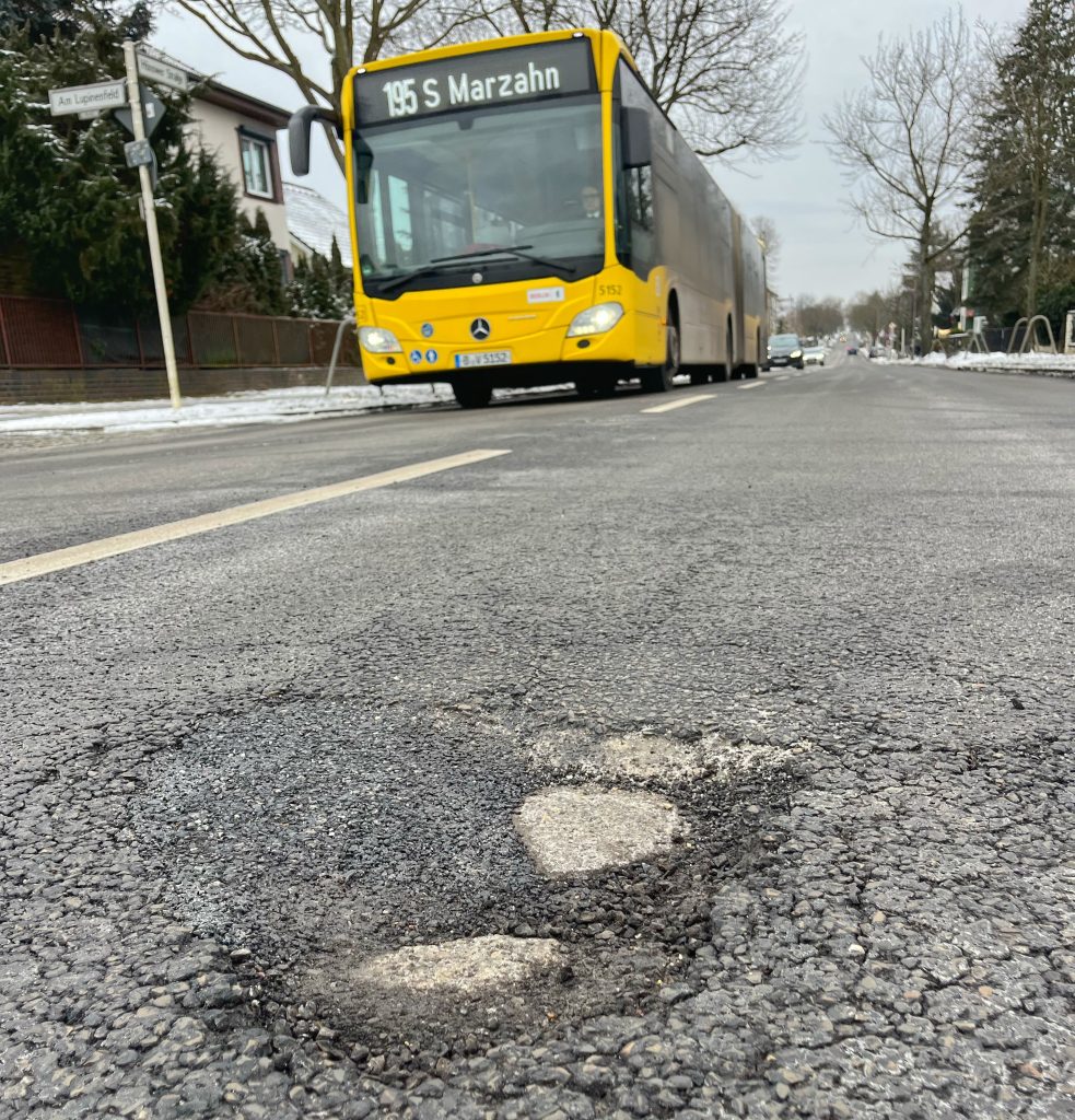 Für Verkehrsteilnehmende bedeuten die Schlaglöcher nicht nur Ärger, sondern auch ein erhöhtes Unfall- und Schadensrisiko. Felgen, Reifen und Fahrwerke können durch tiefe Löcher erheblich beschädigt werden. Zwar reagiert der Bezirk in der Regel mit kurzfristigen Reparaturen, etwa durch das Verfüllen der Löcher mit Kaltasphalt. Diese Maßnahmen sind jedoch meist nur eine Übergangslösung, denn bei anhaltendem Frost halten diese Flickstellen oft nicht lange. Derzeit ist ein Auffüllen mit Asphalt aber eh nicht möglich, wie die Baustelle nach dem Wasserrohrbruch auf der Hönower Straße zeigt. Aufgrund der anhaltenden Minusgrade und der damit verbundenen Arbeitsruhe im Tiefbau sind die Asphalt-Mischwerke derzeit weitestgehend geschlossen.